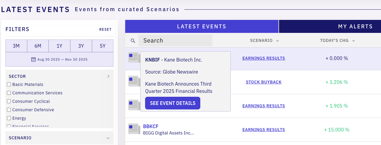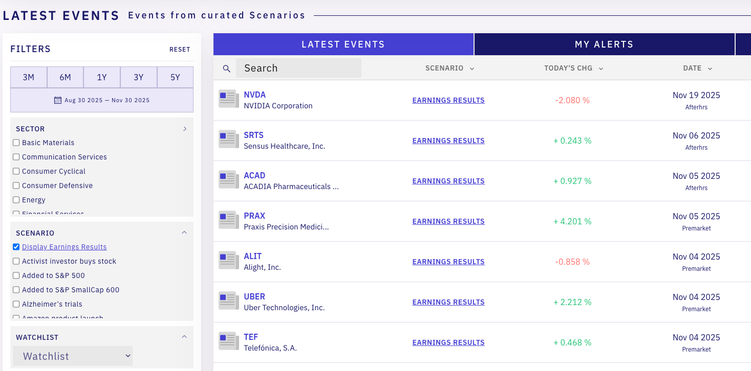 You can browse events and set alerts for companies that meet a certain criteria e.g. Large Cap, High Growth, Tech Companies.