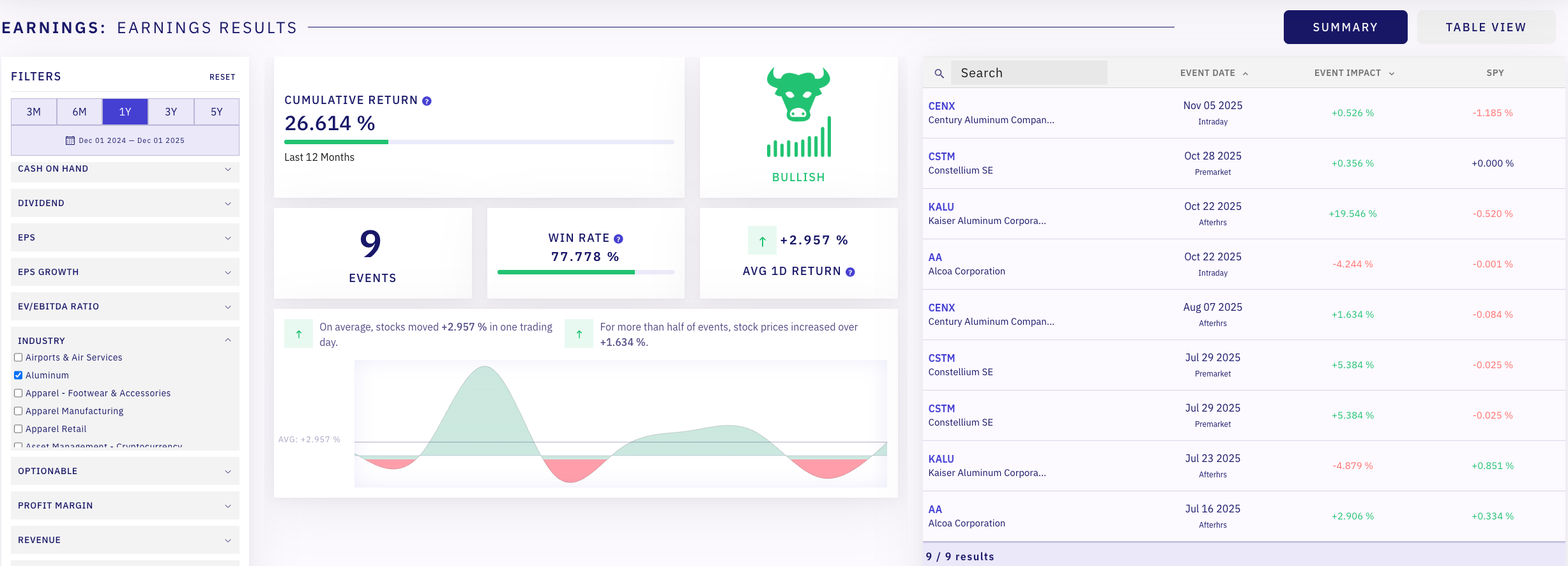 You can set earnings results alerts for companies you are tracking in your watchlist.