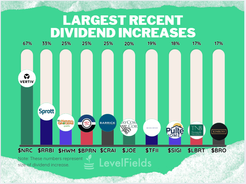 Monthly roundups: LevelFields also publishes monthly lists (example: “Largest Dividend Increases for November 2025”) so you can review the biggest raises in one place and track sector patterns.