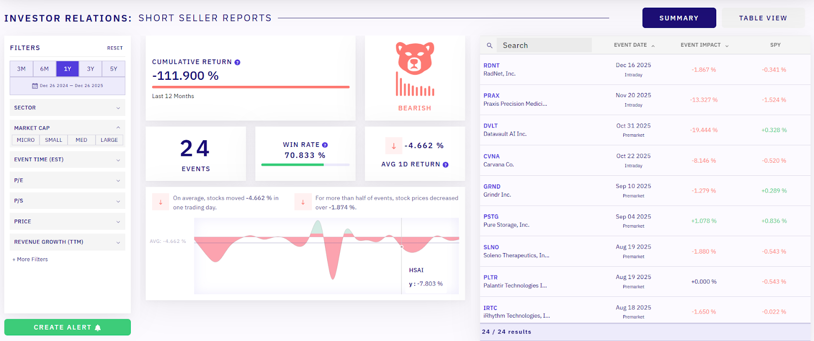 LevelFields alerts users when short seller reports are released and when secondary events, such as lawsuits, occur. The platform shows how similar sequences have historically played out—day by day and over longer horizons—so users can determine whether pressure is intensifying or fading.